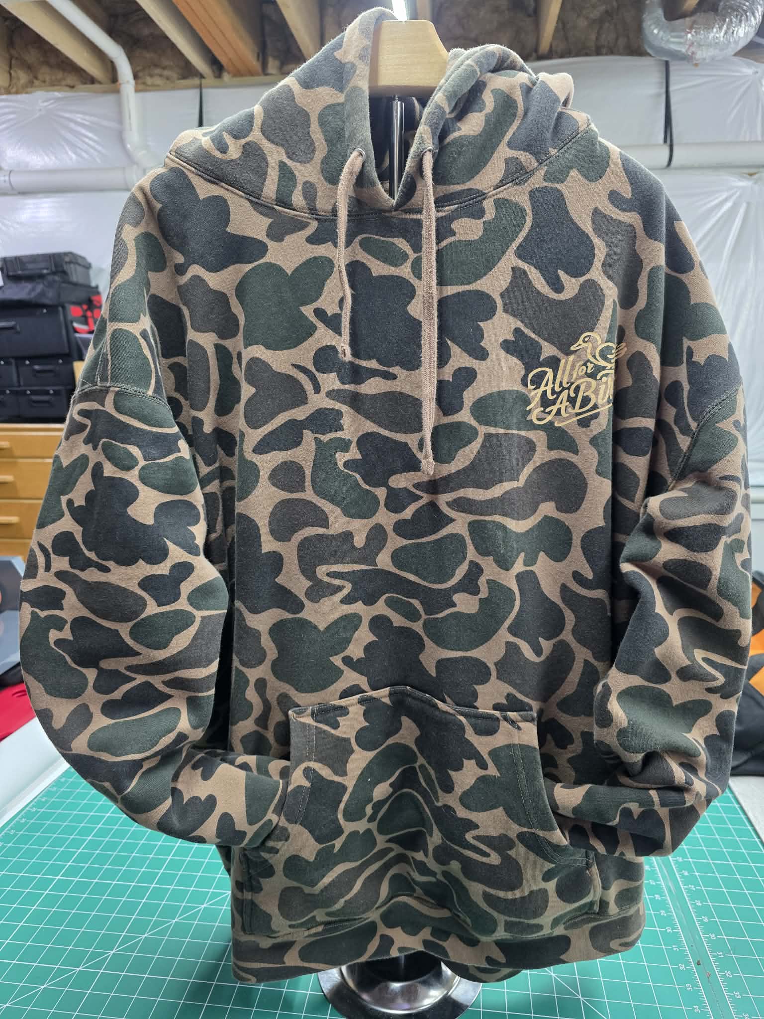 This limited-edition Duck Camo Hoodie features a timeless waterfowl scene—quiet, patient, and purposeful—capturing the calm before the first birds fly. Designed from real experiences in the blind, this piece represents everything All For A Bird stands for: tradition, camaraderie, and the stories that unfold when the world slows down.